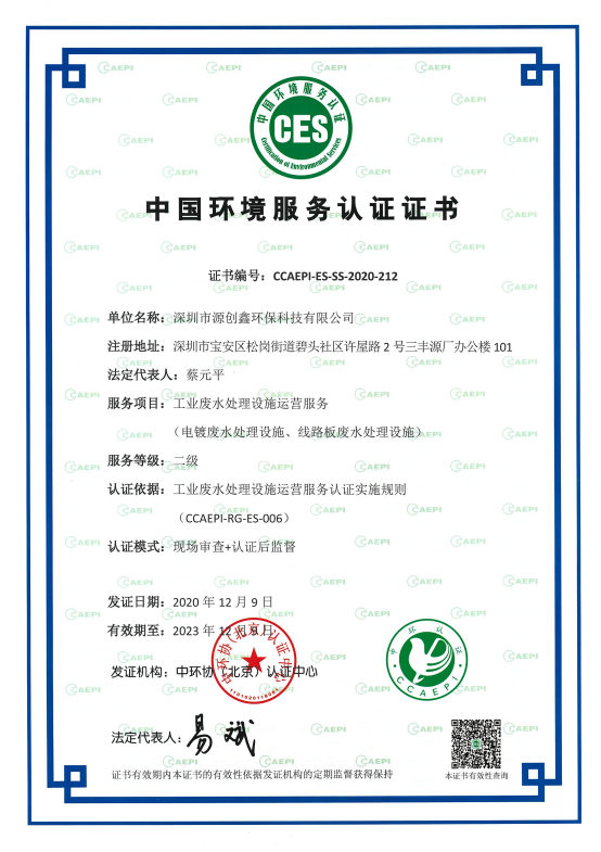 中國環(huán)境服務(wù)體系認(rèn)證證書-廢水處理設(shè)施運(yùn)營服務(wù)