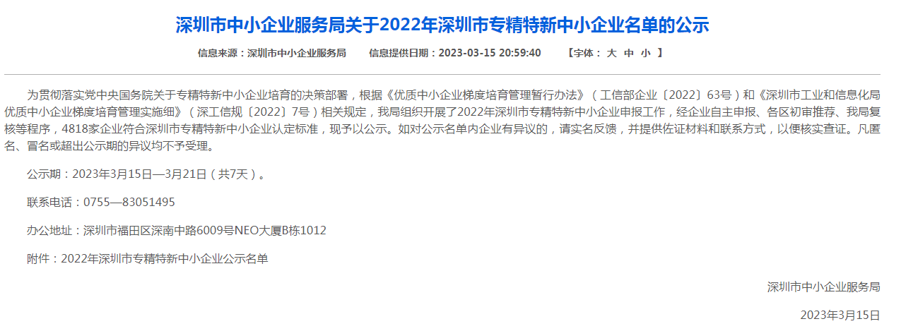 重大喜訊!我公司被評為深圳市2022年度“專精特新”中小企業(yè)